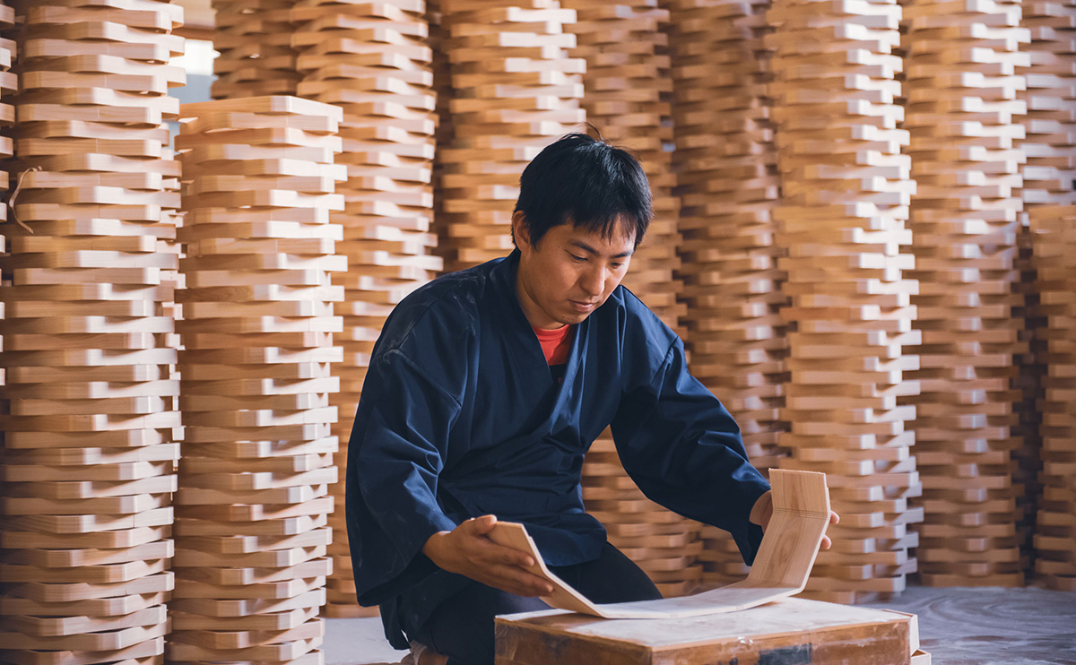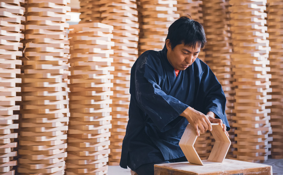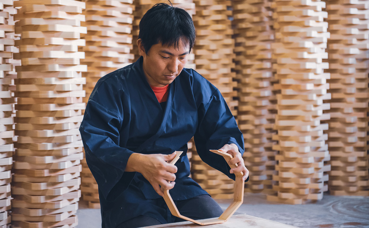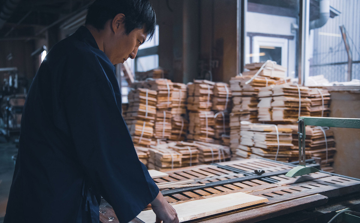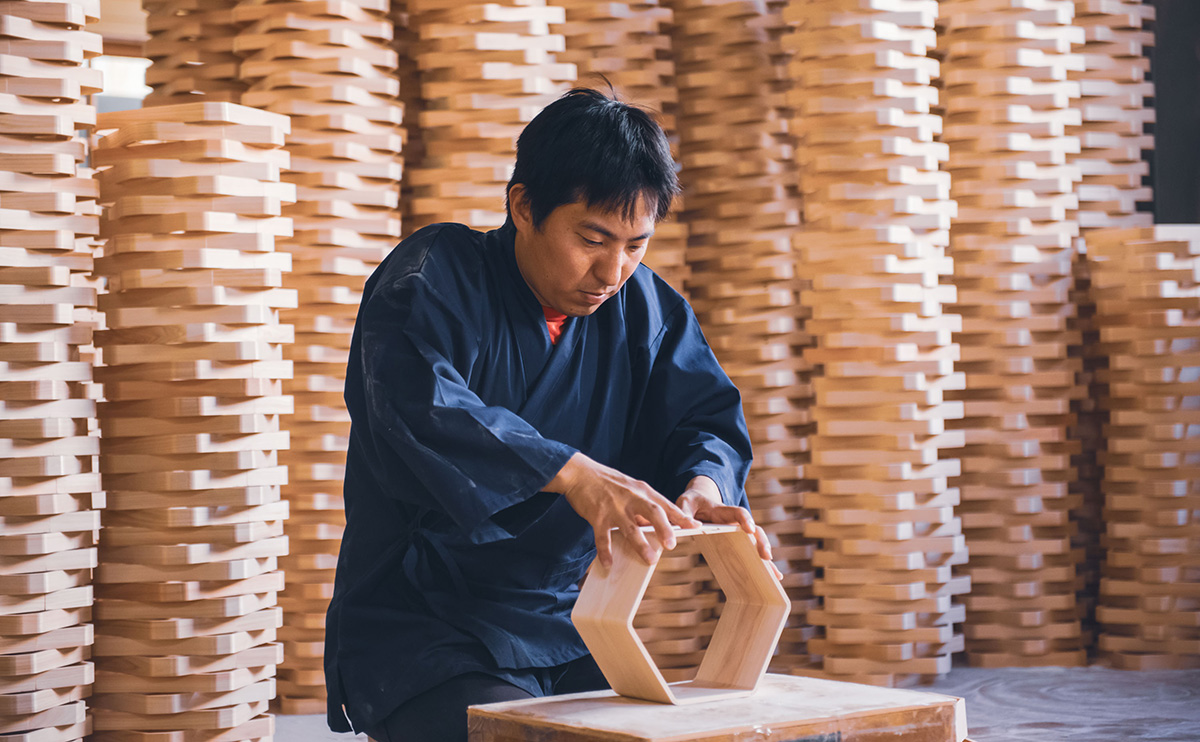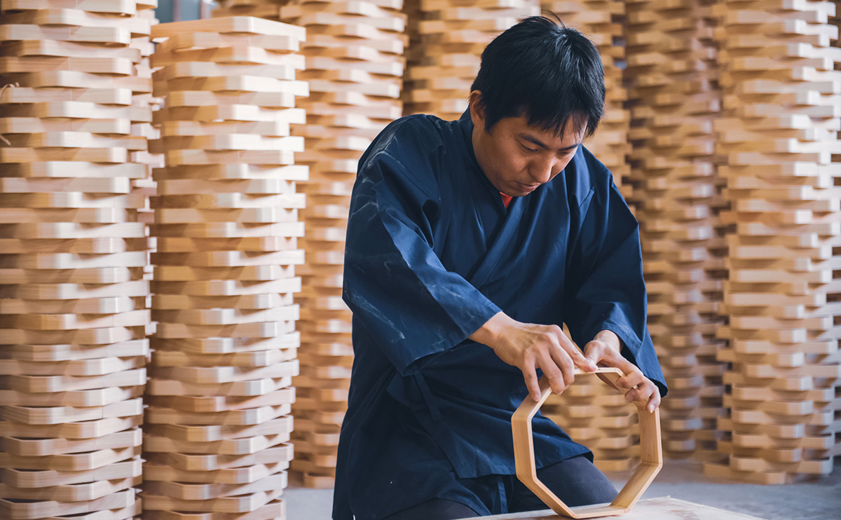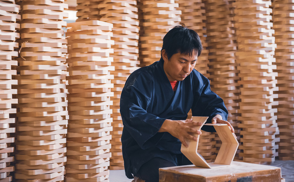 吉谷木工所は奈良県吉野郡下市町にあります。下市町は吉野郡の北西に位置し、古くから吉野山地と大和平野を結ぶ交通の要衝、市場町として栄えてきました。全体の約80%を緑の山々が占め、澄み切った清流である秋野川、丹生川に彩られた自然豊かな土地です。古代から続く長い歴史に育まれてきた地にある吉谷木工所は、伝統工芸である「三宝」を守り続けながら、日常に新しい日本のしつらいを生み出しています。