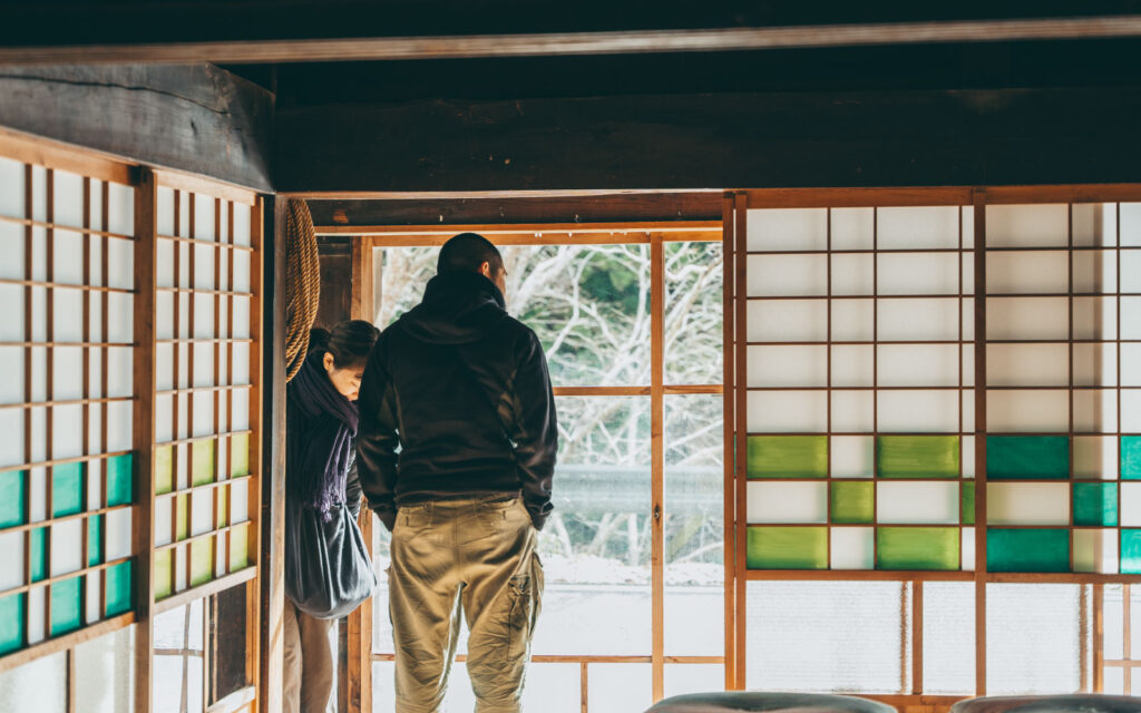 昔ながらの土壁に型板ガラスの木製建具がはめ込まれたその家を、二人は一目で気に入った様子です。ここは最近空き家になったばかりということで、比較的状態が良く、すぐにでも住めそうな印象。日当たりも良好で、家の前には庭や畑も付いています。