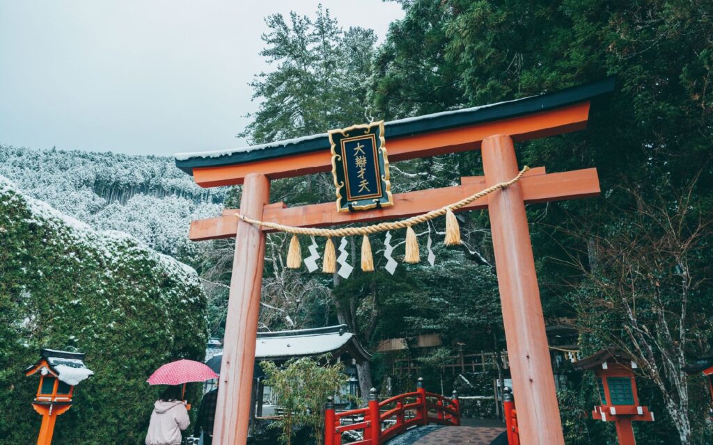 この日は天河大辨財天社で行われる「朝拝」に参加。凍てついた雪道を踏むと、静かな参道にシャリシャリと心地よい音が響きます。