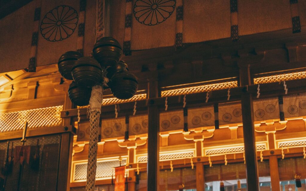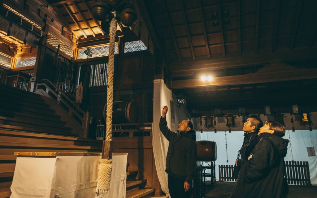 本殿に向かう祭壇の前にかけられた本坪鈴は、神宝である「五十鈴」を模した独特の形状をしています。総重量は30キロにもなるというだけあって鈴尾綱はずっしりと重く、大人の力でもやっと持ち上がるかどうかというぐらいです。稔さんや利治さんがぐるりと回すと、カランカランという聞きなれた音とは違う、重く奥行きのある和音が響きました。