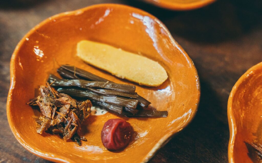 炊きたての土鍋ご飯に具だくさんの豚汁、お漬物の盛り合わせの中には自家製のからすみも並びます。