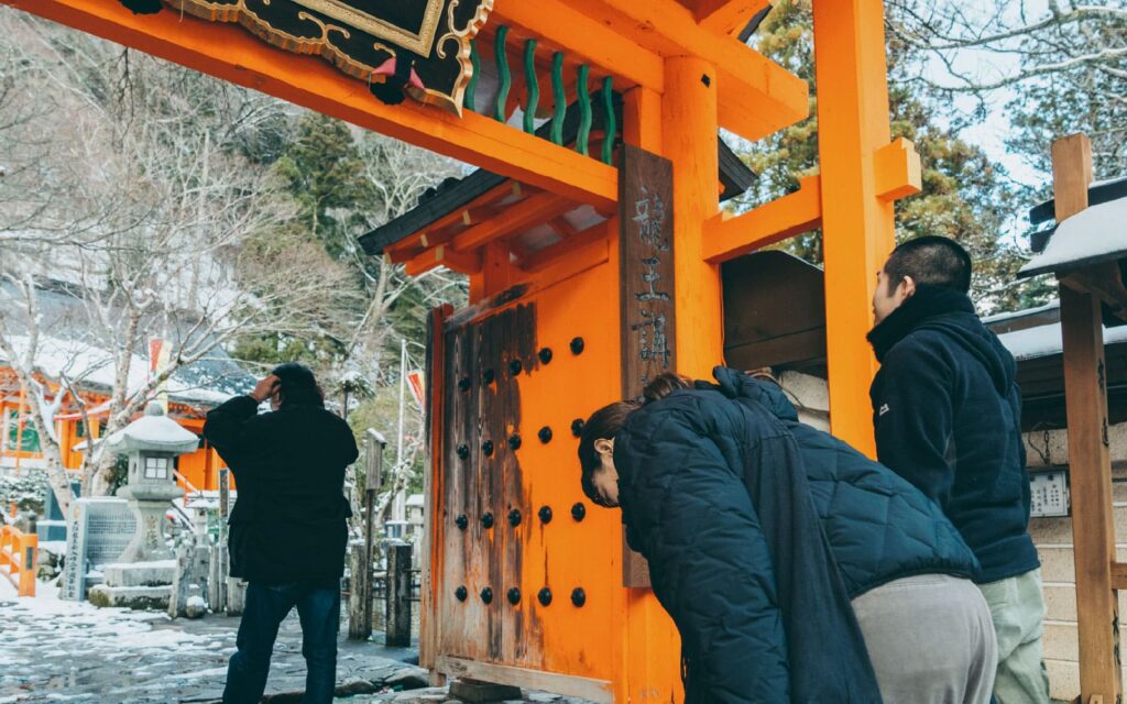 参拝を終えてお神酒で身を清め、清々しい表情の二人が吐く息は、朝の清澄な空気にくっきりと白く浮かんでいました。