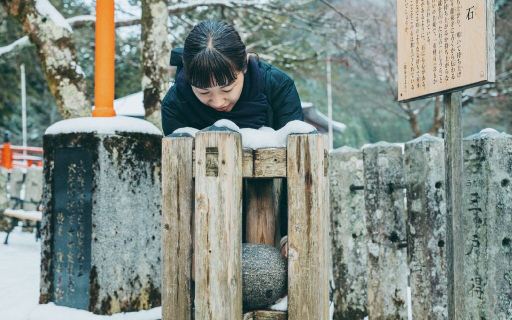 利治さんのガイドを聞きながらお参りし、境内にある「重軽石」にチャレンジしたり、修験者が水行や瀧行を行う行場を見学したり。