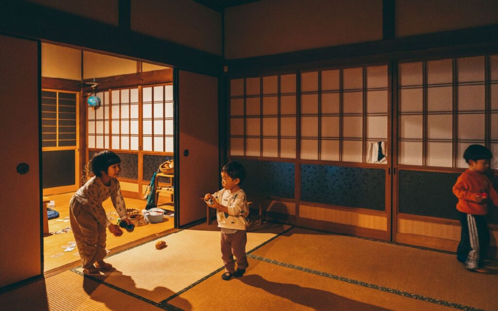 キッチンは調理とおしゃべりで盛り上がり、居間では子どもたちが仲睦まじく戯れ合っています。