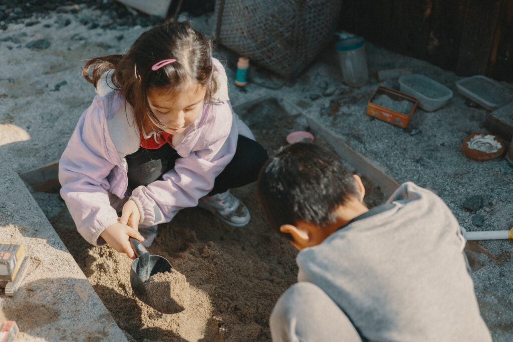恥ずかしがってなかなか車を降りられずにいた長女の以呂波ちゃんの様子を見に行くと、いつの間にか北森家の次男・心野くん、末っ子の月基ちゃんと一緒に砂場遊びに夢中でした。