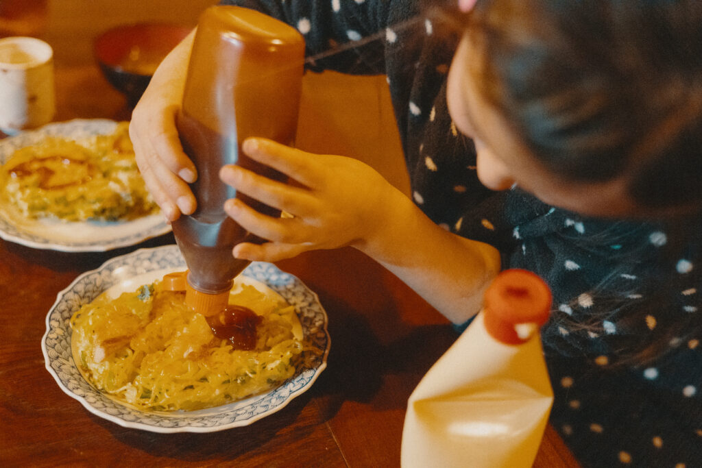 今夜の夕食は大阪出身の由季さんお手製のお好み焼きと、デザートの米粉シフォンケーキ。焼き立てホカホカのお好み焼きに、以呂波ちゃんがソースとマヨネーズでデコレーションしてくれます。