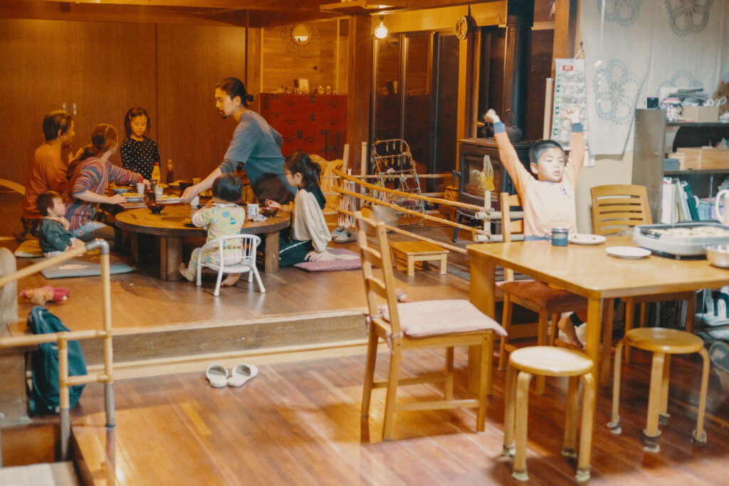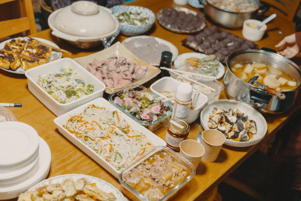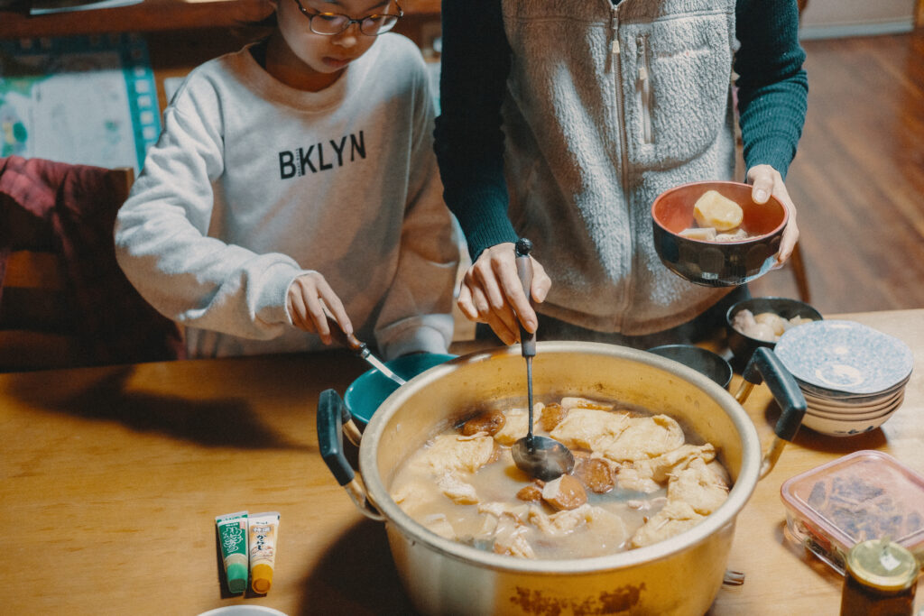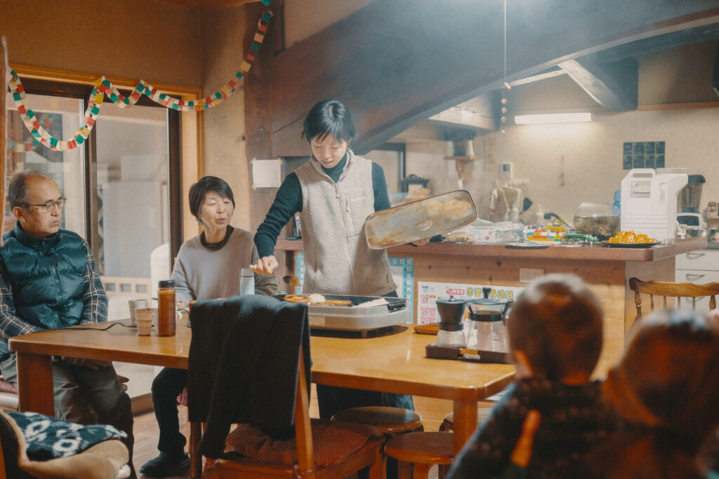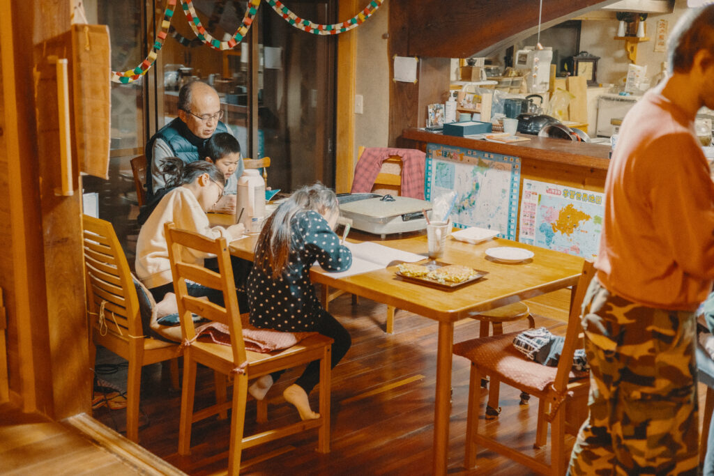 夜は地域の方との交流会が行われました。二日間で出会った家族や深野の集落に住まう方、このプロジェクトを担当する県職員や参加するきっかけを作ってくれた夫婦と子どもたち。それぞれに料理を持ち寄って、大人も子どもも大盛り上がりの大宴会です。