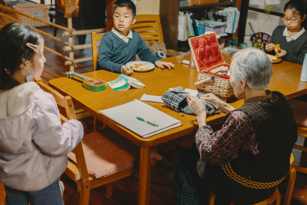 二日目の朝、こんがり焼けたトーストと、望さんが淹れてくれるコーヒーの芳ばしい香りに包まれて一日がスタートしました。「おはよう」と声をかけあって、北森家4世代の家族が次々にリビングに集まる中、最年長者のおばあちゃんは、席につくなり裁縫仕事に取り掛かります。