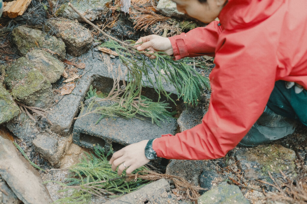 途中で拾った杉葉のフィルターを手早く交換し、ちょろちょろと流れだす水を汲みながら、克弥さんはこの場所への思いを話してくれました。