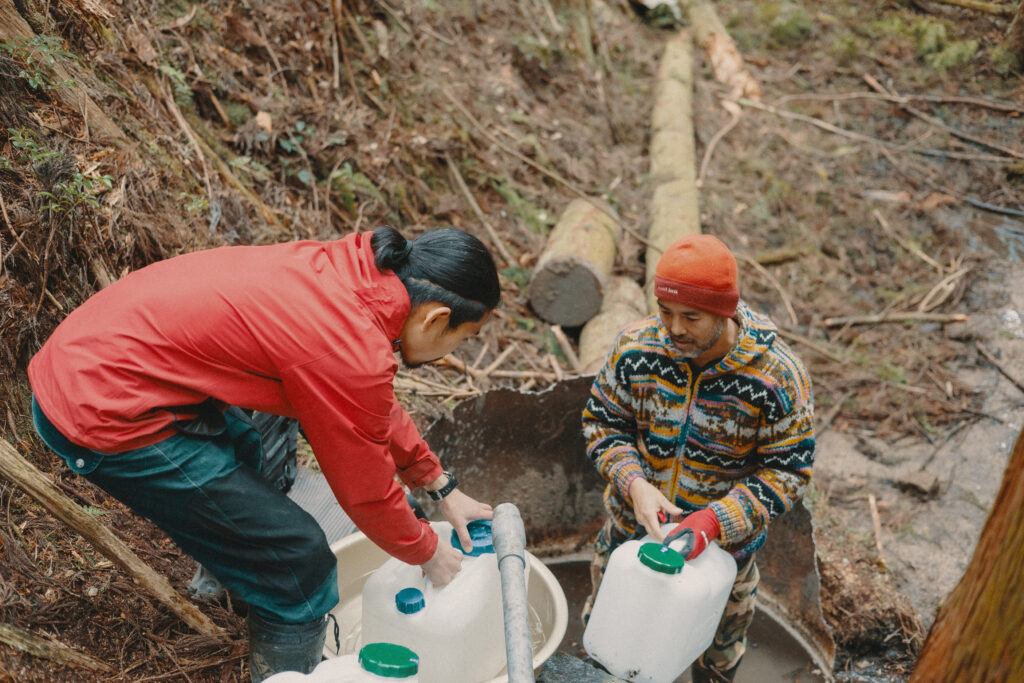 朝食を済ませたら、克弥さんと望さんの二人は井戸水を汲みに行く準備を始めます。深野には上水道が通っていますが、飲食用の水は克弥さんが二日に一回、裏山を歩いて汲みに行っているそう。食べ物やライフラインの自給に興味のある望さんは、ぜひ同行したいと自身もタンクを用意していました。