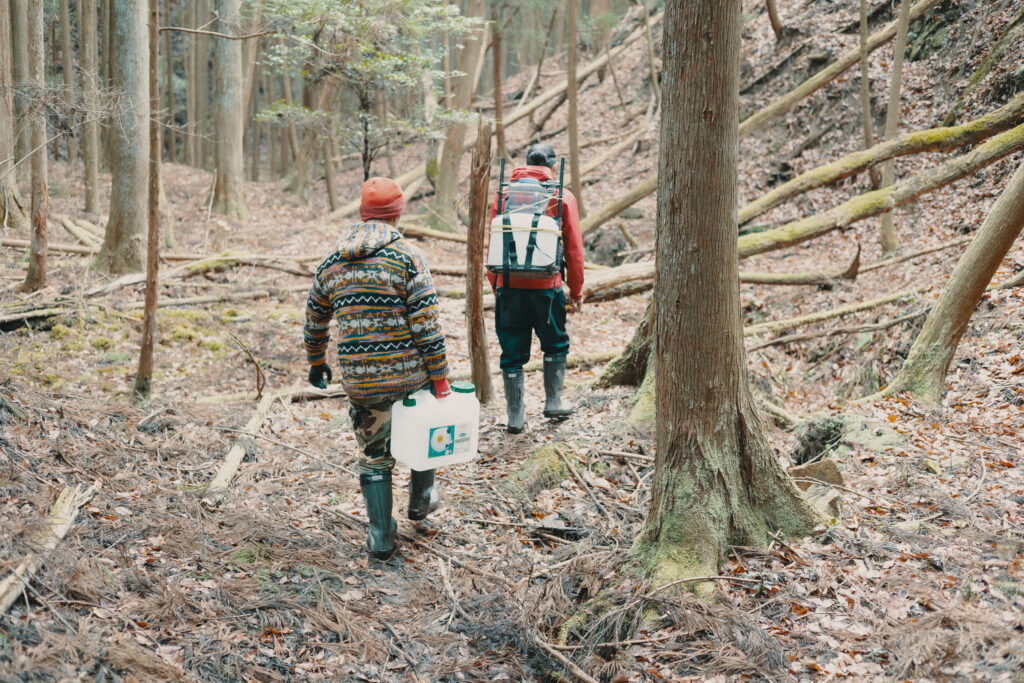 克弥さん:昔、この辺は闇米を作る棚田やったらしいです。生きていくために必要やったんでしょうね。その後植林されたけど、もともと田んぼやったから木も倒れやすくて、手入れが十分行き届いてないせいで暗いし、荒れてる。ここを仲間たちと手入れしていきたいって話してるんですよ。重い水を持って往復するのは手間やけど、こうして山の中を歩いていろいろ考える時間を持つのも大切なんかなって感じてます。