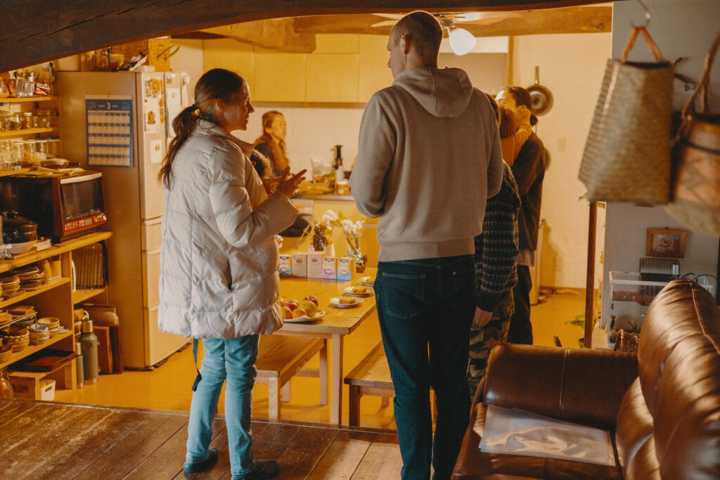 次に向かったのは北森家からもほど近い本願さんのお宅です。お茶を出してくださり、先程いただいたバナナケーキを皆で頬張りながら、家を探す際に意識したことや、現在の暮らし、仕事、市の補助についてなど、じっくりとお話を伺います。