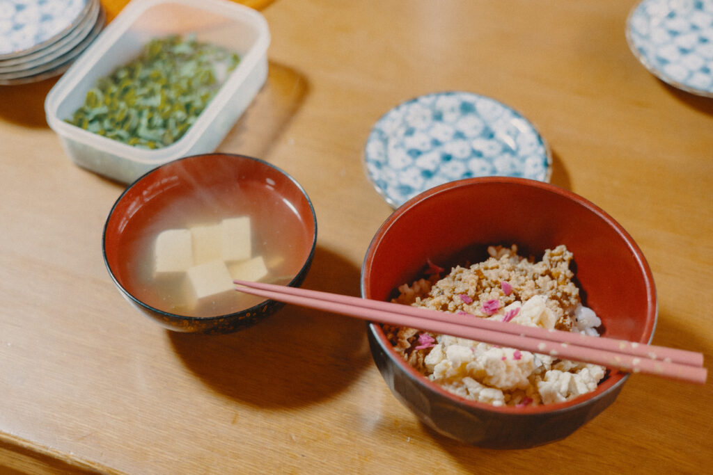 周辺の集落の様子と知人からの空き家情報を併せて克弥さんに案内してもらいながら、お昼過ぎに一旦帰宅。昼食に用意してくれていたそぼろ丼とお吸い物をいただきます。