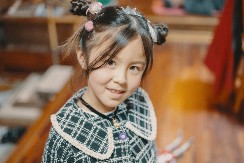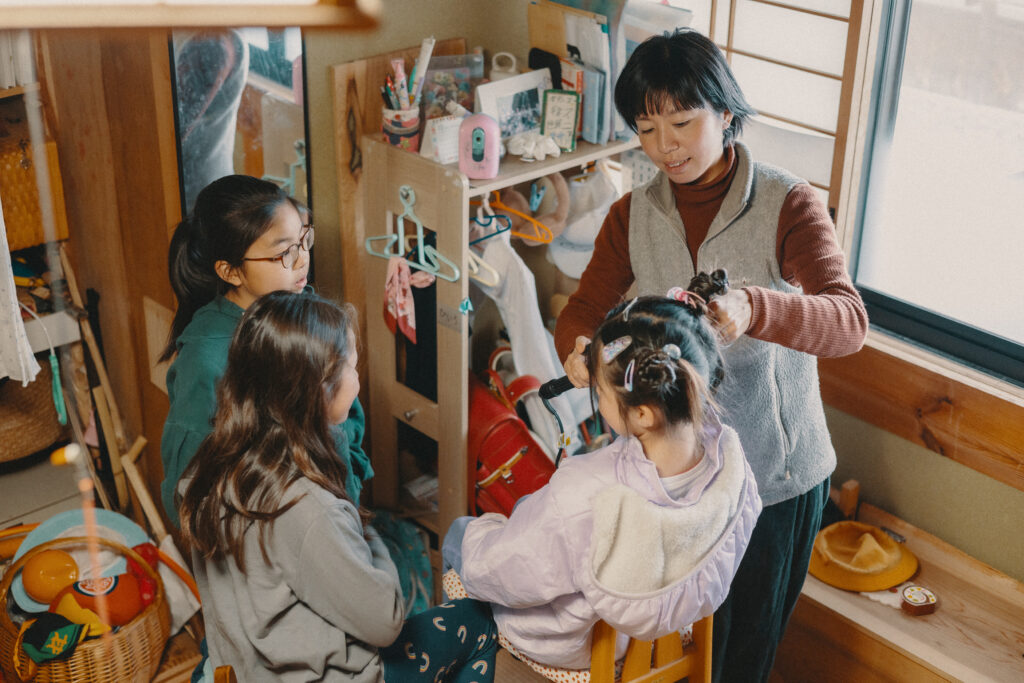それぞれとっておきのワンピースに着替え、日彩ちゃんのアクセサリーを借りて身に着けたり、美容室ごっこで由季さんに髪をセットしてもらったりと大はしゃぎ。各家の子どもたち8人が皆入り交じって楽しく遊ぶ姿を、小原夫妻は目を細めて見守っていました。