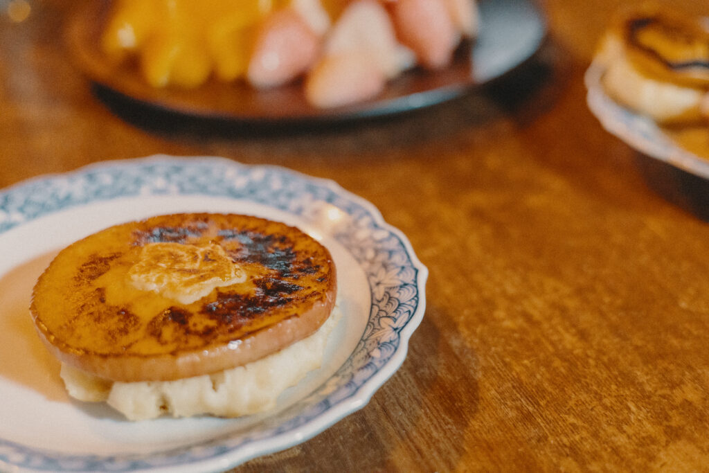 朝食は林檎のパンケーキとフルーツの盛り合わせ。バターのよい香りが漂うリビングで、和やかなひとときを過ごします。