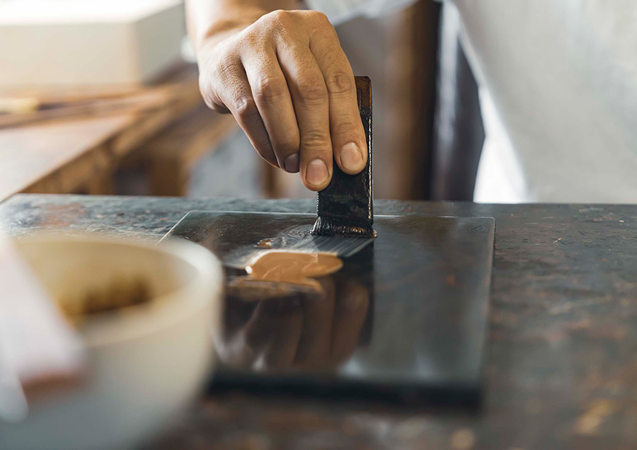 Another surprising quality is its gentle feel to the touch. Lacquer has a moisture balance close to that of human skin, allowing it to blend naturally with the fingertips. Even the Japanese character for “urushi,” which combines elements associated with water, wood, and people, seems to reflect this nature.