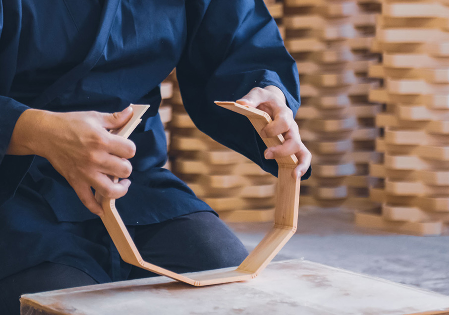 奥大和では古来、生活に必要な道具には伐り出した木々が活用されてきました。南北朝時代には、吉野に南朝を開いた後醍醐天皇への献上物を載せる器として「三宝(さんぽう)」が作られました。三宝は、檜や杉をごく薄くした板材を挽き曲げと呼ばれる技術で角を曲げて仕上げる曲物(まげもの)の一つ。明治初期には和歌山など近隣から技術者が集まり、神事に用いる祭具や、鏡餅を載せるお正月飾りとして三方や膳が多く制作されたといいます。今でもその技術は引き継がれています。