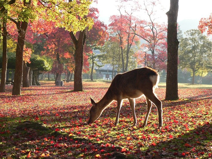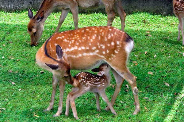 奈良公園では、シカにエサを与えることを禁止しています(鹿せんべいは例外です)。奈良公園のシカは野生動物であり、公園内に生えている植物(シバ、葉っぱ、ドングリなど)を主食とし、それらを自力で食べて生きています。