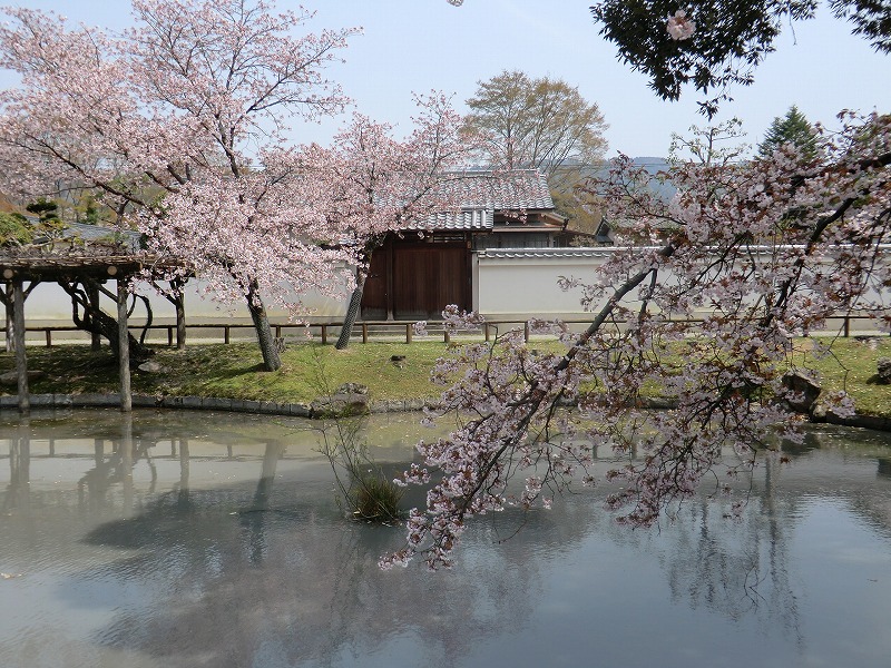築地塀を背景に、ナラノココノエザクラがきれいです。