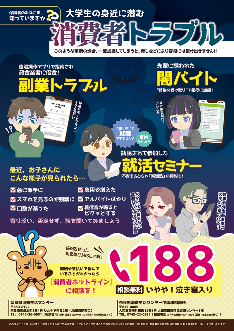 大学生における消費者トラブル予防の啓発を目的とし,大学生の保護者に向けた啓発チラシを奈良教育大学と協働で作成しました。