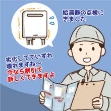 すぐに給湯器の点検を行い「劣化しているのでいずれ壊れる。火災の心配もある」などと言って、新しい機器への交換を勧められた。「今なら割引できる」と言われ、約30万円の契約をした。
