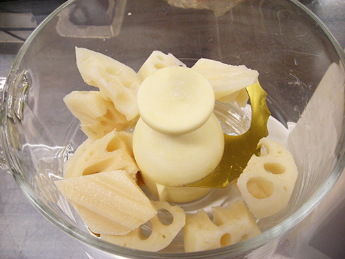 レンコンの皮をむき、クッキングカッターにかける。(すりおろしてもよい)