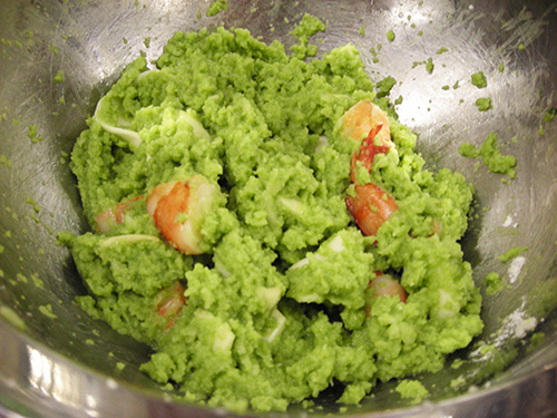 海老は殻をむき、背わたを取ってさっと茹で、2~3個に切る。