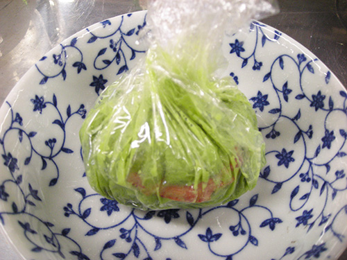 2個に分けて茶巾しぼりのようにラップで包み、電子レンジで2分30秒(500W)加熱する。